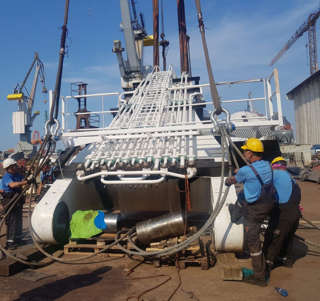 Montaż fundamentu koparki, łoża obrotowego, kabiny operatora, ramienia wraz z siłownikami podnoszenia oraz łyżki koparki. Zaprojektowanie i wykonanie narzędzi i osprzętu technologicznego do bezpiecznego wykonania zadania. Napinanie śrub łożyska wieńcowego M48 prasą hydrauliczną w 4 etapach napinania. Opracowanie technologii montażu w oparciu o wymogi Armatora i przeprowadzenie montażu w/w elementów na jednostce.